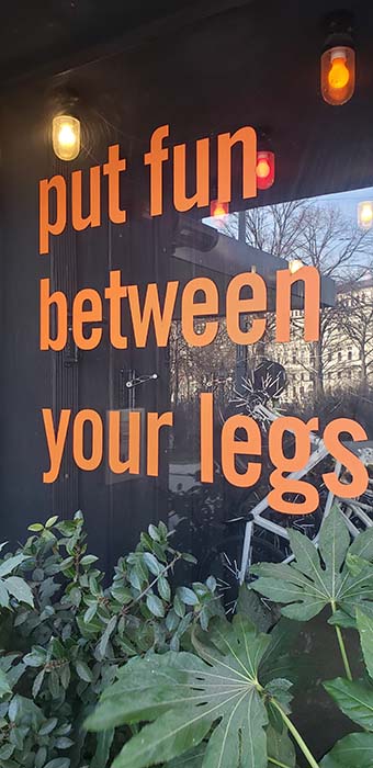 I was walking down the street when a store sign caught my eye: “Put fun between your legs.”